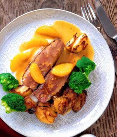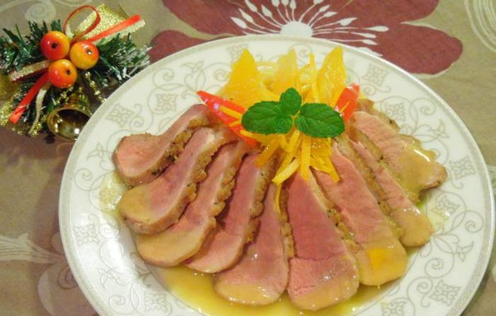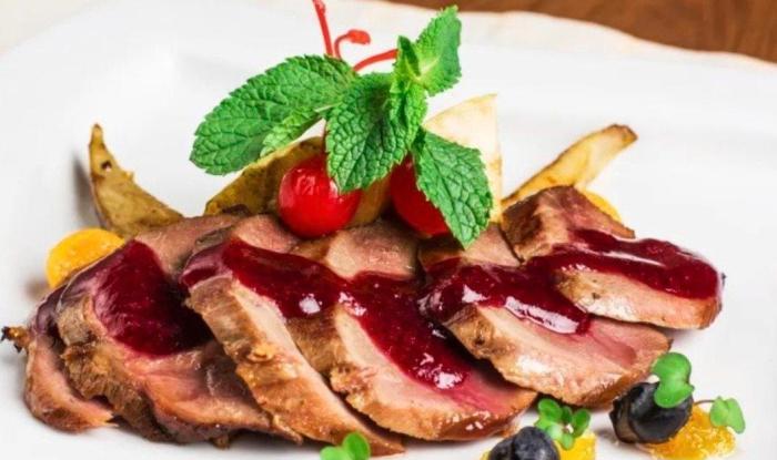 7. 裝盤與淋醬:烤好的鴨胸肉取出,靜置5分鐘後切片。將切好的鴨胸肉整齊擺放在盤中,然後將濃縮好的橙香醬汁淋在上面,最後撒上些許橙皮屑或迷迭香裝飾。