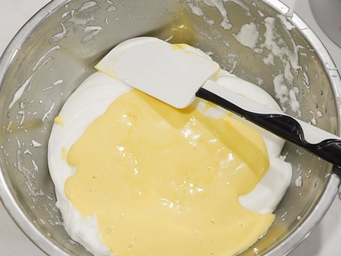 - 取1/3蛋白霜入蛋黃糊: 用刮刀挖取約1/3打發好的蛋白霜,放入之前做好的蛋黃糊中。